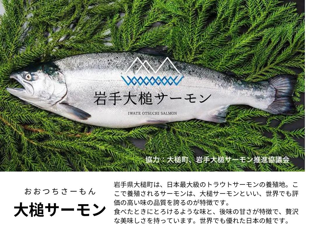 大槌サーモンは大槌町が養殖するトラウトサーモンのこと。とろけるよような口どけに、甘い美味しさが満載の鮭で、お子様やサーモン好きにはたまらない品です。